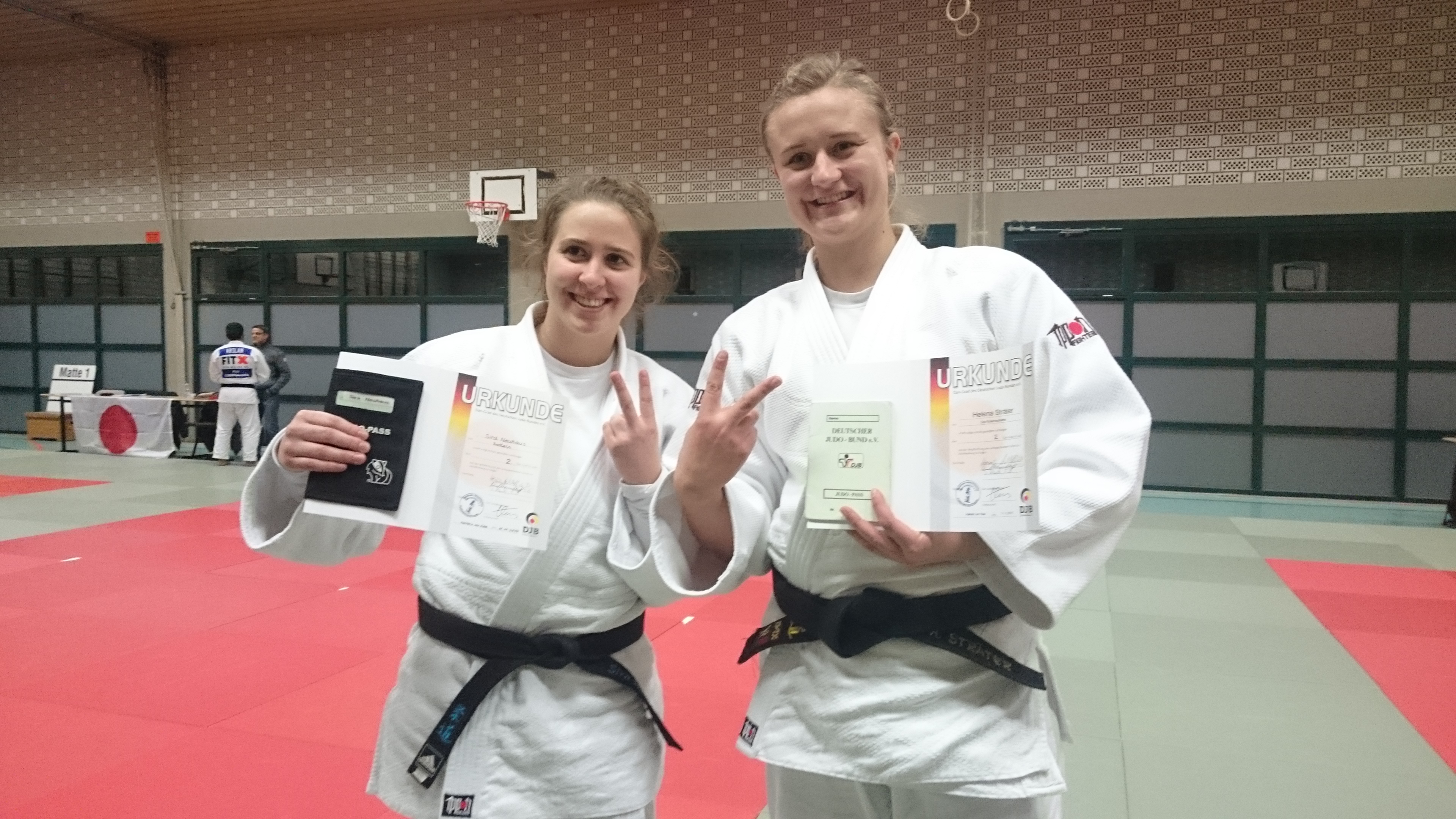 Sie zeigen es an: ab sofort glückliche Träger des 2. Dan Sira Neuhaus (links) und Helena Sträter (rechts).