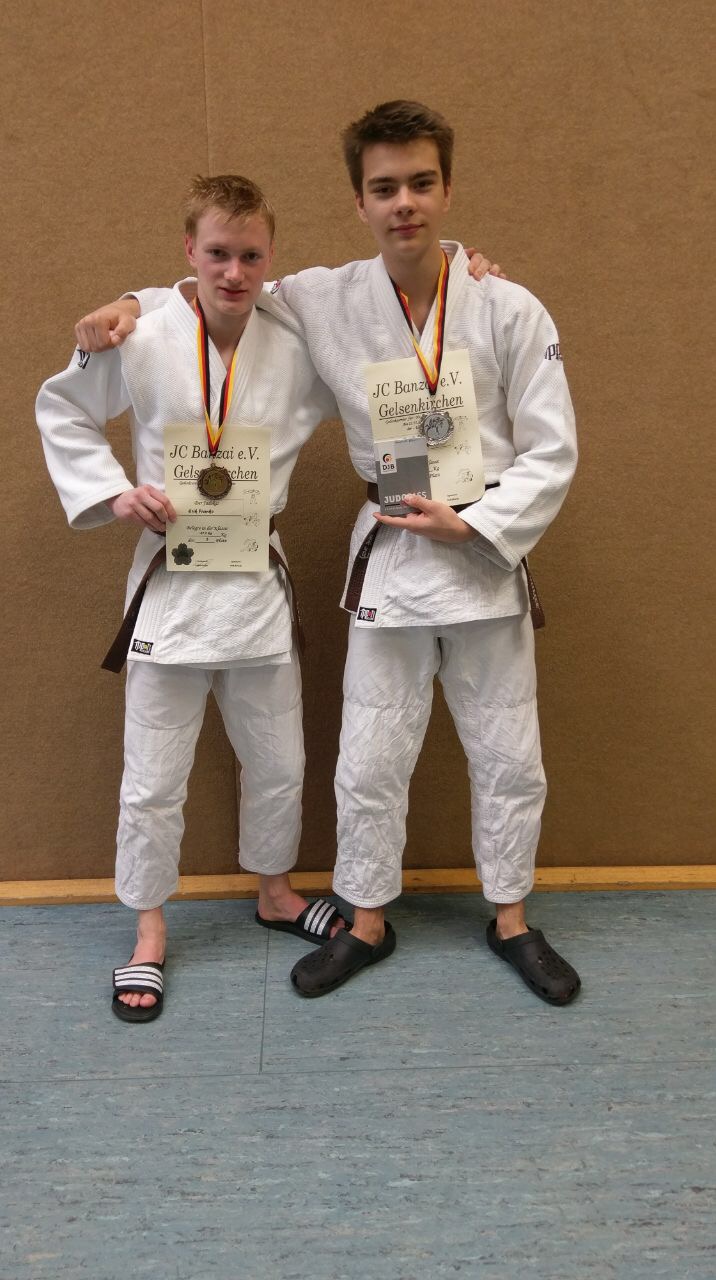 Maurice Bäcker erarbeitete sich während des Kampfes immer mehr Vorteile. Schließlich konnte er seinen Gegner nach einem Wurf direkt in einen Haltegriff nehmen und so die Begegnung vorzeitig für sich entscheiden. Auch im zweiten Kampf sah es erst gut aus. Im weiteren Verlauf konnte er allerdings nicht mehr so viele Akzente setzen und verlor. Die Silbermedaille war ihm aber trotzdem sicher. Zweiter hertener Starter war Erik Franke. Gleich die beiden ersten Kämpfe hatten es in sich. Starke Gegner forderten Erik Franke konditionell gleich aufs Äußerste. Hier machte sich seine längere Wettkampfpause vor einiger Zeit bemerkbar, da seine Gegner ihre größere Erfahrung nutzen konnten und Erik Franke ihnen den Vortritt lassen musste. Sein letztes Duell konnte er aber für sich entscheiden. Damit erreichte er Platz drei.