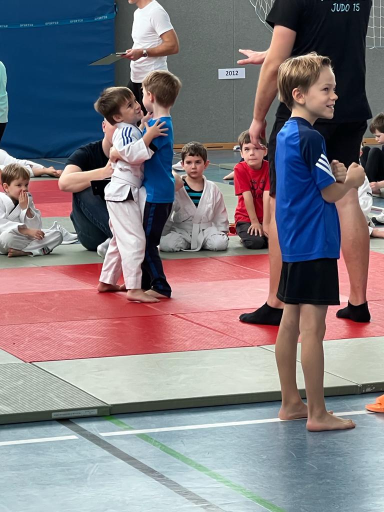 Die letzte Station war das Bärenringen auf den Judomatten. Dort sind immer zwei Kinder gegeneinander angetreten. Die Aufgabe war es, beide Arme unter die Arme des Gegners zu bekommen, so, als würde man ihn umarmen. Der Gegner musste dies verhindern, aber auch gleichzeitig versuchen seine Arme unter die seines Gegners zu bekommen. Somit hatten auch Kinder ohne Erfahrung mit Judo, eine Chance zu gewinnen.