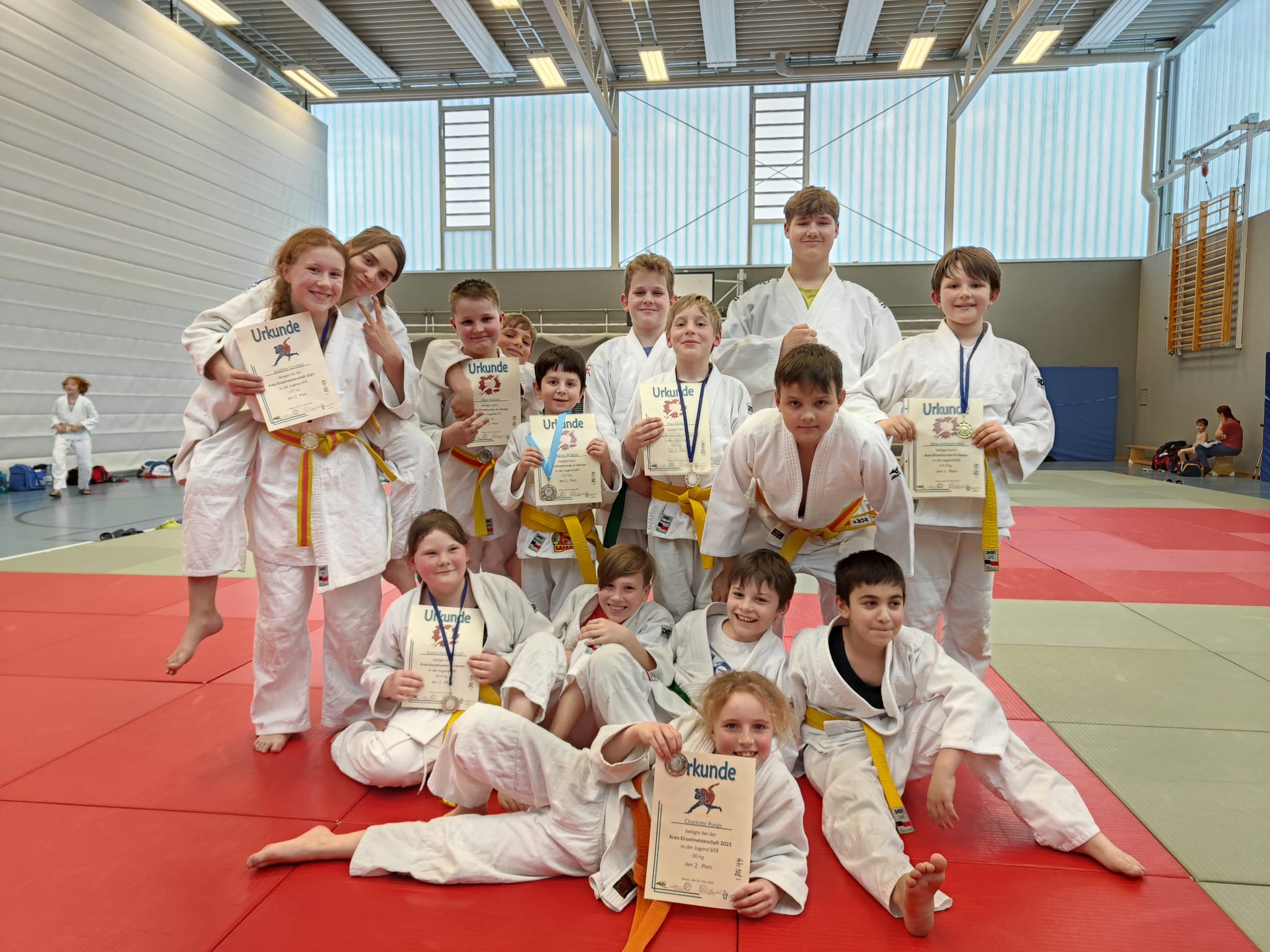 U13 auf die Tatami. Alle hatten das Ziel, eine Medaille zu ergattern, im Sinn. Dies schafften sie auch, denn am Ende erhielten sie 5 Goldmedaillen, 9 Silbermedaillen und 4 Bronzemedaillen.