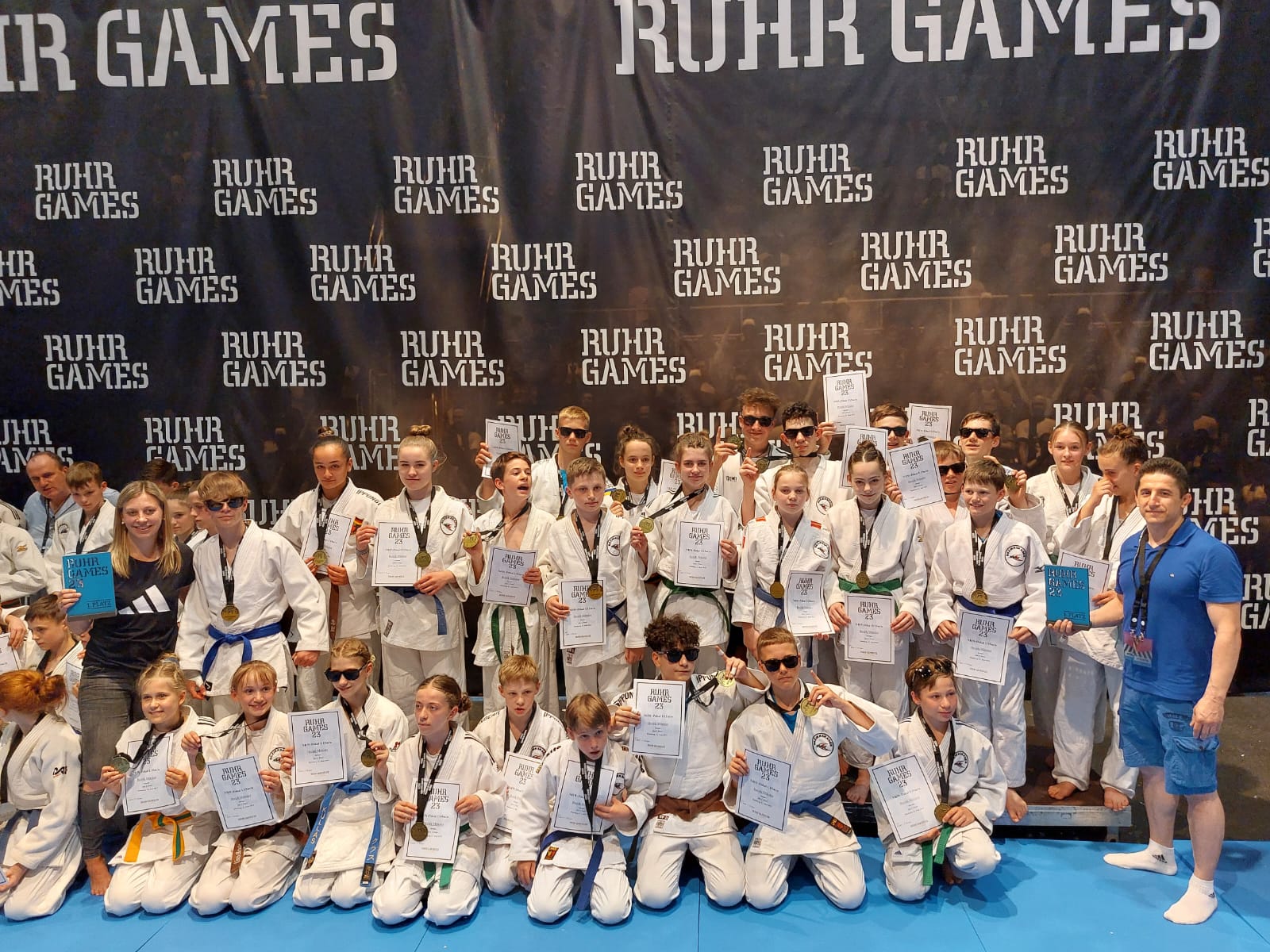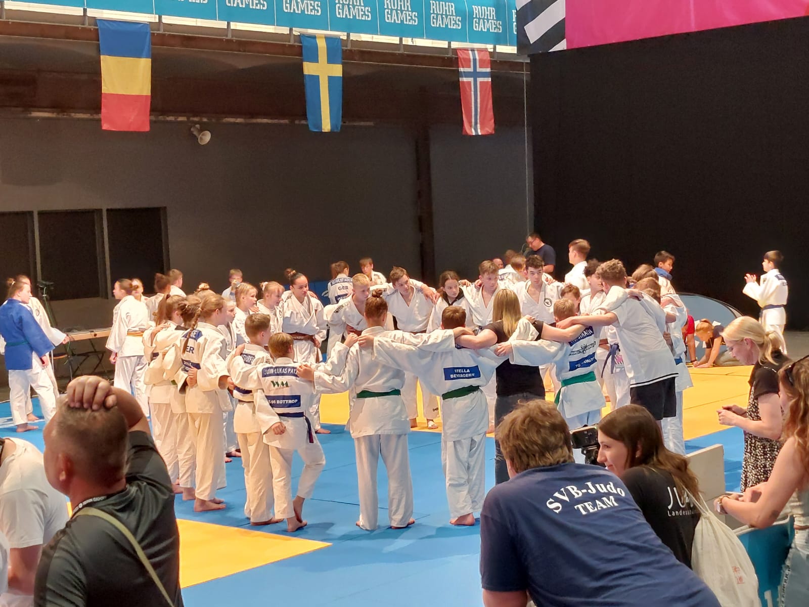 Am letzten Tag der Ruhr Games in Duisburg traten die Auswahlmannschaften der fünf Regierungsbezirke zum NRW-Pokal U15 an. Für den Bezirk Münster waren auch drei AthletInnen des JST Herten nominiert. Ammely Kaptur, Lukas Kauch und Julie Lauer unterstützten ihr Team auf und neben der Matte tatkräftig (Julie ist nach einem Beinbruch noch nicht wieder fit). In einer einzigartigen Atmosphäre und mit sehenswertem Judosport gewann der Nachwuchs des Bezirkes Münster eindrucksvoll und für viele überraschend die Goldmedaille!